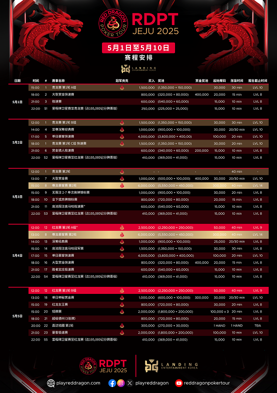 2025年5月1日至5月10日,红龙杯将在济州神话度假村再次点燃战火——主赛事250万韩元买入,主赛保底20亿韩元,创下系列赛新高。
